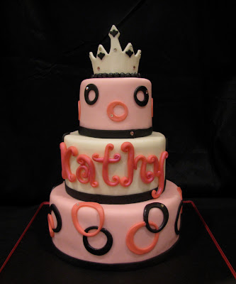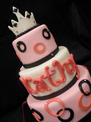 This is a birthday cake I did for Kathy who turned 40. She wanted pink and black circles and everyone says she’s a princess, so I put a cute crown on top. I added sparkly Swarovski crystals on the circles and crown to add a little bling. The cake was dark chocolate with dolce de leche buttercream filling.