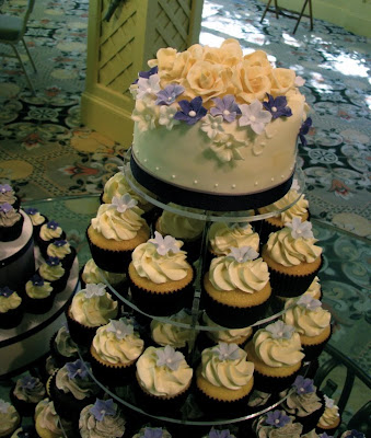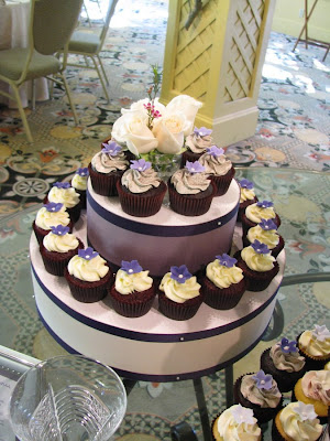 So this Saturday I had two incredible cupcake weddings. This wedding was at Felicita and was coordinated by the very talented Susan Moran with V&M Wedding Concepts and the flowers were designed by Blooms by Vickrey. The accent color was eggplant. I decided to try something a little different by creating 2 flanking cupcake stands next to the large tower. I loved how this turned out. The 200 cupcake flavors were red velvet with cream cheese frosting, vanilla cupcakes with strawberry buttercream frosting, vanilla cupcakes with vanilla buttercream frosting and dark chocolate cupcakes with Oreo frosting.