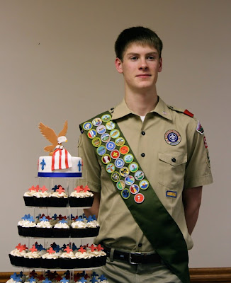 I had the pleasure and honor of creating a cupcake tower and dessert table design for the celebration after the court of honor ceremony for Andrew.
