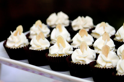 Mini white cupcakes with almond buttercream frosting and a little almond sliver on top.