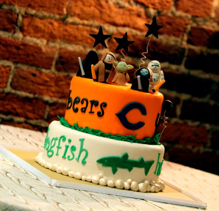 So what do you think of the groom’s cake? A combo of Ron’s favorite things…Star Wars, Chicago Bears and Dogfish Head Brewery. The cake was banana cake with chocolate ganache and chocolate buttercream filling.