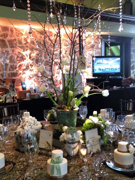 To continue with the nature theme, the centerpiece included tall branches and tulips which drew your eyes upwards. Brilliant crystals dangled from the branches and the table numbers hung from the branches too.